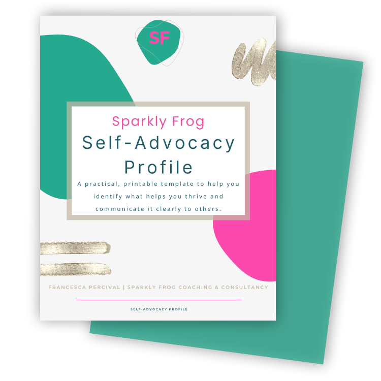 By signing up, you agree to receive emails related to The Self-Advocacy Profile and other updates from Sparkly Frog Coaching & Consultancy. We respect your privacy and will never share your information. You can unsubscribe at any time. For more details, please read our privacy policy.